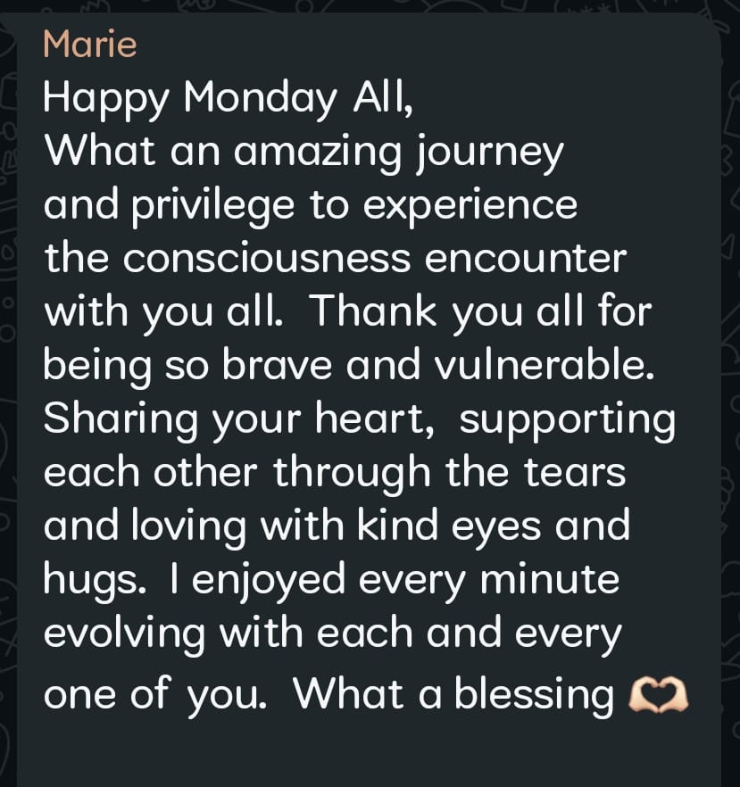 Sharing is always invited, never required. You can participate fully by doing your own internal work and witnessing others. The group energy is powerful whether you speak or stay silent.